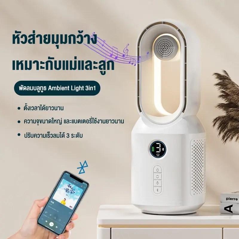 • ทำไมต้องตัวนี้: ขอปิดท้ายลิสต์ด้วยแกดเจ็ตที่เหมือนหลุดมาจากโลกอนาคตครับ! นี่ไม่ใช่แค่พัดลมไร้ใบพัดที่ให้ลมเย็นสบายและปลอดภัยกับเด็กๆ แต่ยังเป็น “ศูนย์รวมความบันเทิงและไลฟ์สไตล์บนโต๊ะทำงาน” เพราะมันมาพร้อมกับ ลำโพงบลูทูธ ให้คุณเปิดเพลงฟังเพลินๆ, ไฟกลางคืน LED ที่ปรับสีได้, และยังมี แบตเตอรี่ในตัว ทำให้มันเป็นพัดลมไร้สายที่ยกไปวางตรงไหนก็ได้ ถือเป็นอุปกรณ์ที่ตอบโจทย์ไลฟ์สไตล์คนยุคใหม่ที่ต้องการความมินิมอลและฟังก์ชันที่หลากหลายในเครื่องเดียว